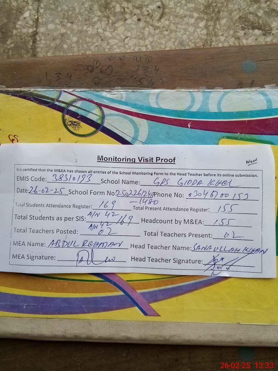 | Attendance Register | Head Teacher | MEA with School | Visit Proof |