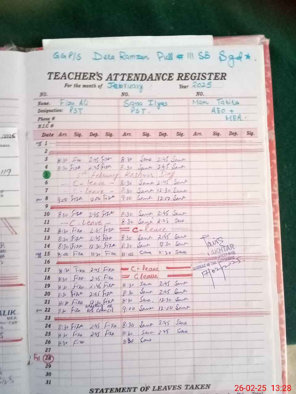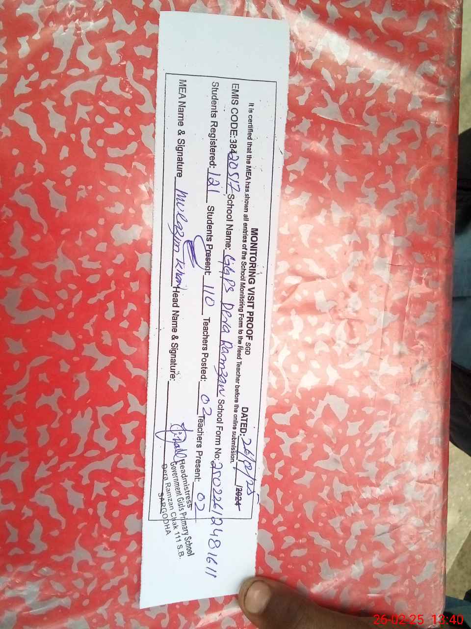 | Attendance Register | Head Teacher | MEA with School | Visit Proof |