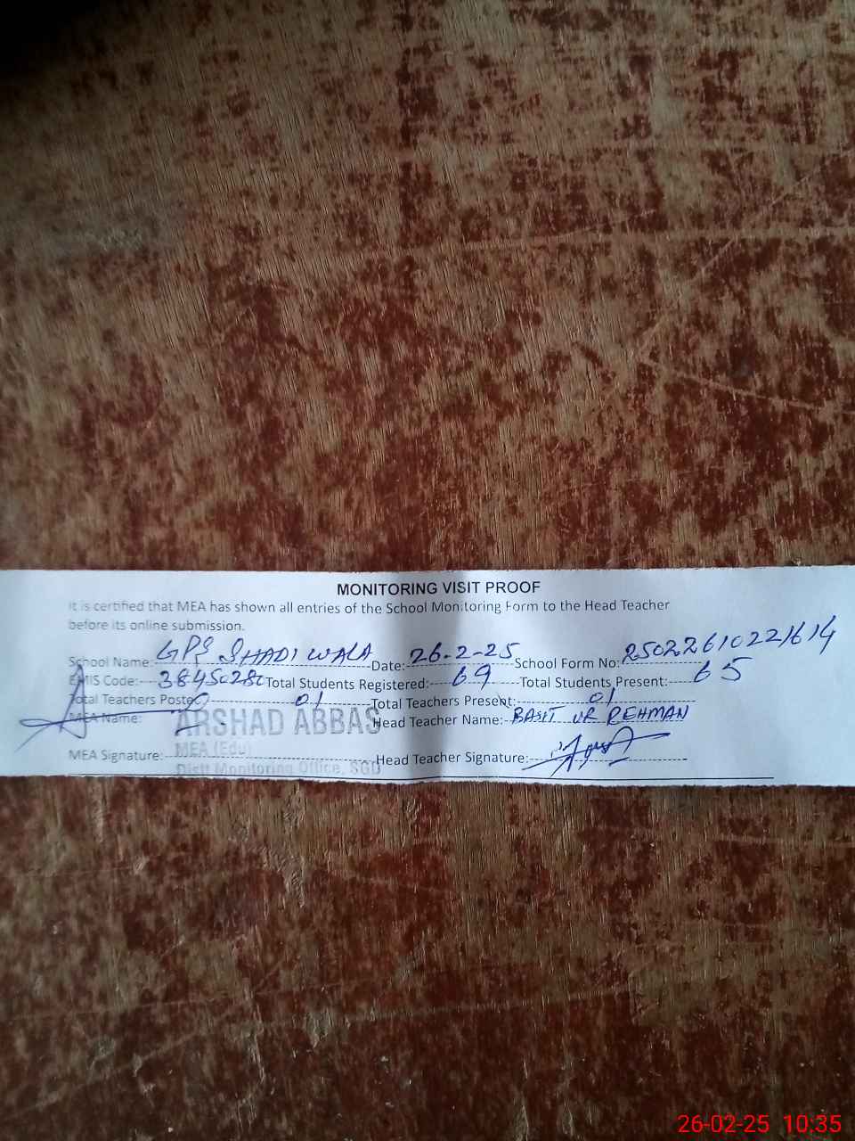 | EMIS Code: 38450280 | Name of School: GPS SHAHDI WALA | |||