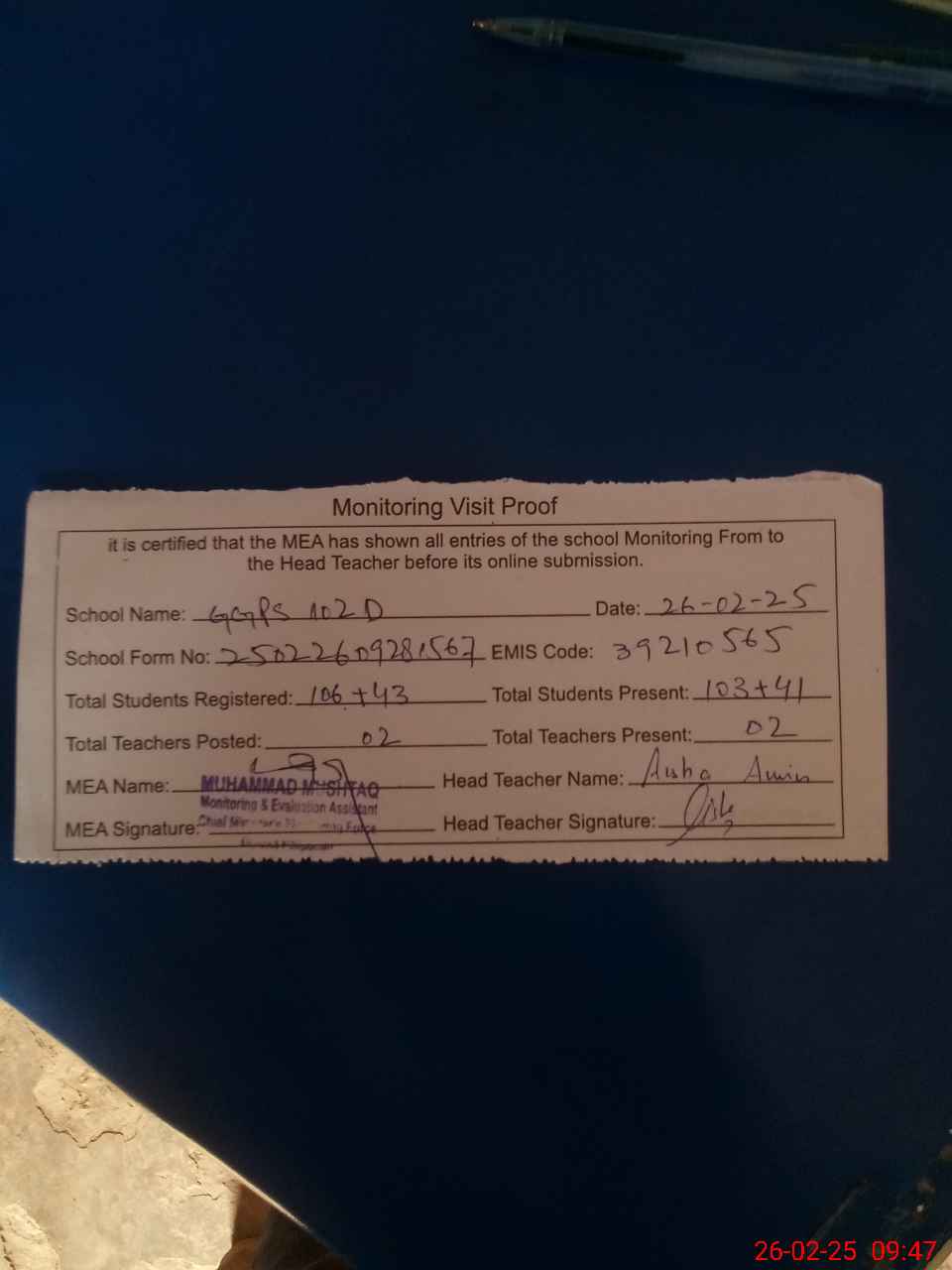 | Attendance Register | Head Teacher | MEA with School | Visit Proof |