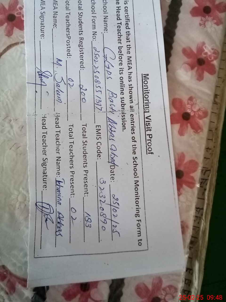| Certified that this School was Inspected by the Undersigned MEA/DMO Today and the Information Stated Above is as Per Record. | |||||