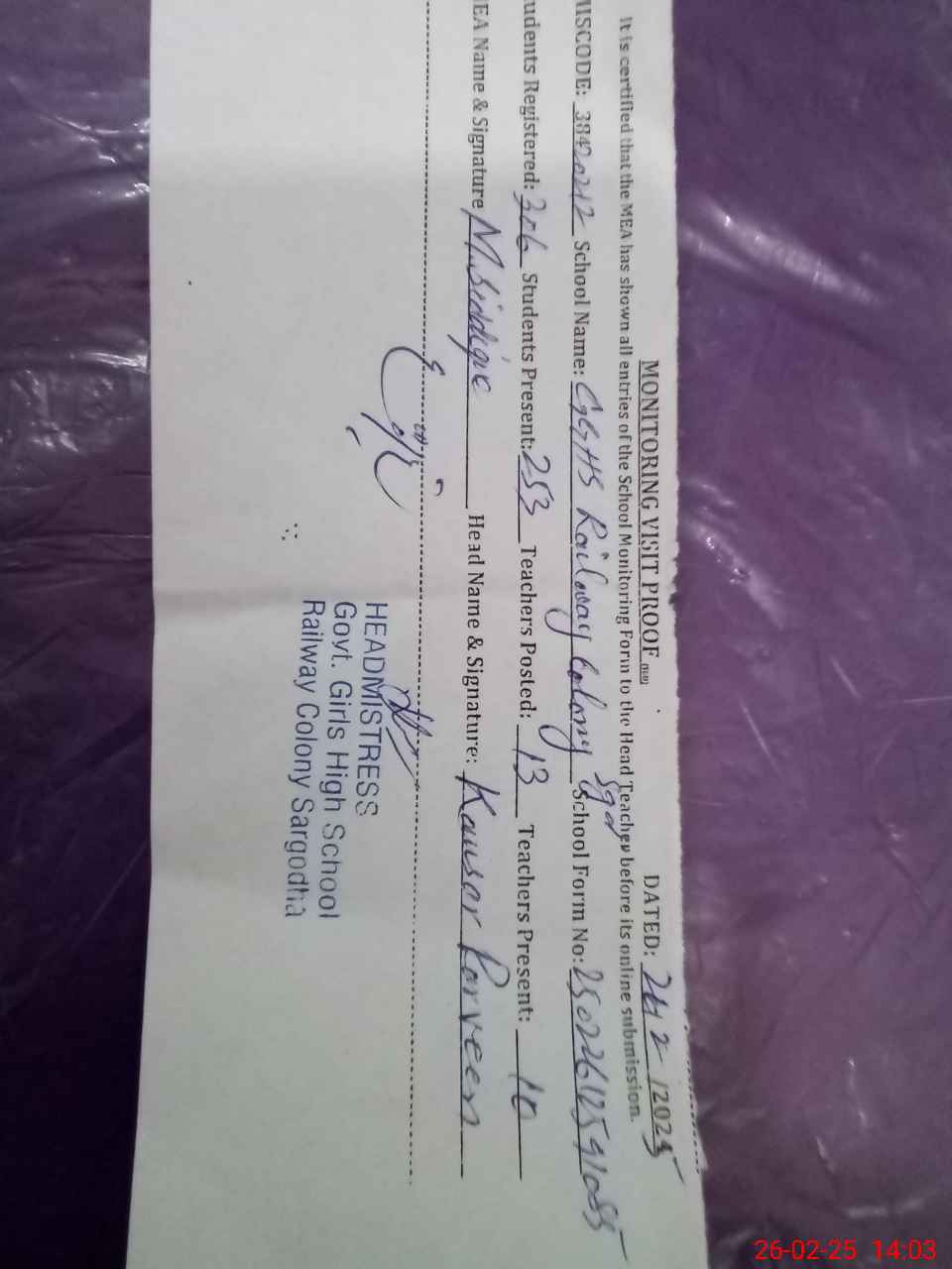 | EMIS Code: 38420212 | Name of School: GGHS RAILWAY COLONY SARGODHA | |||
