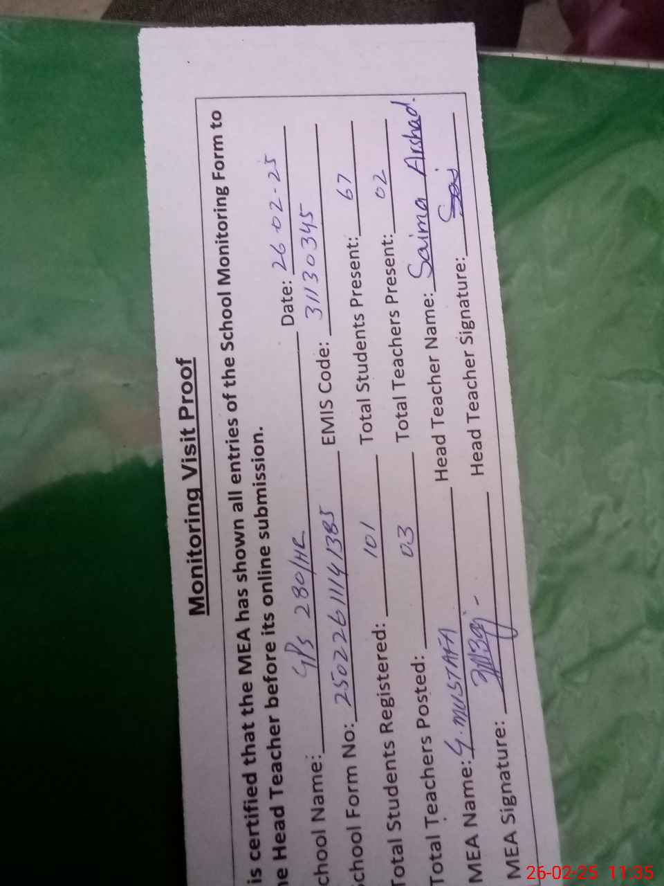 | Attendance Register | Head Teacher | MEA with School | Visit Proof |