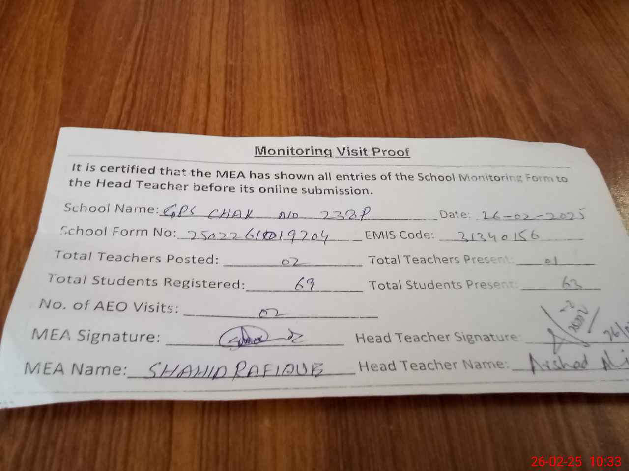 | Attendance Register | Head Teacher | MEA with School | Visit Proof |