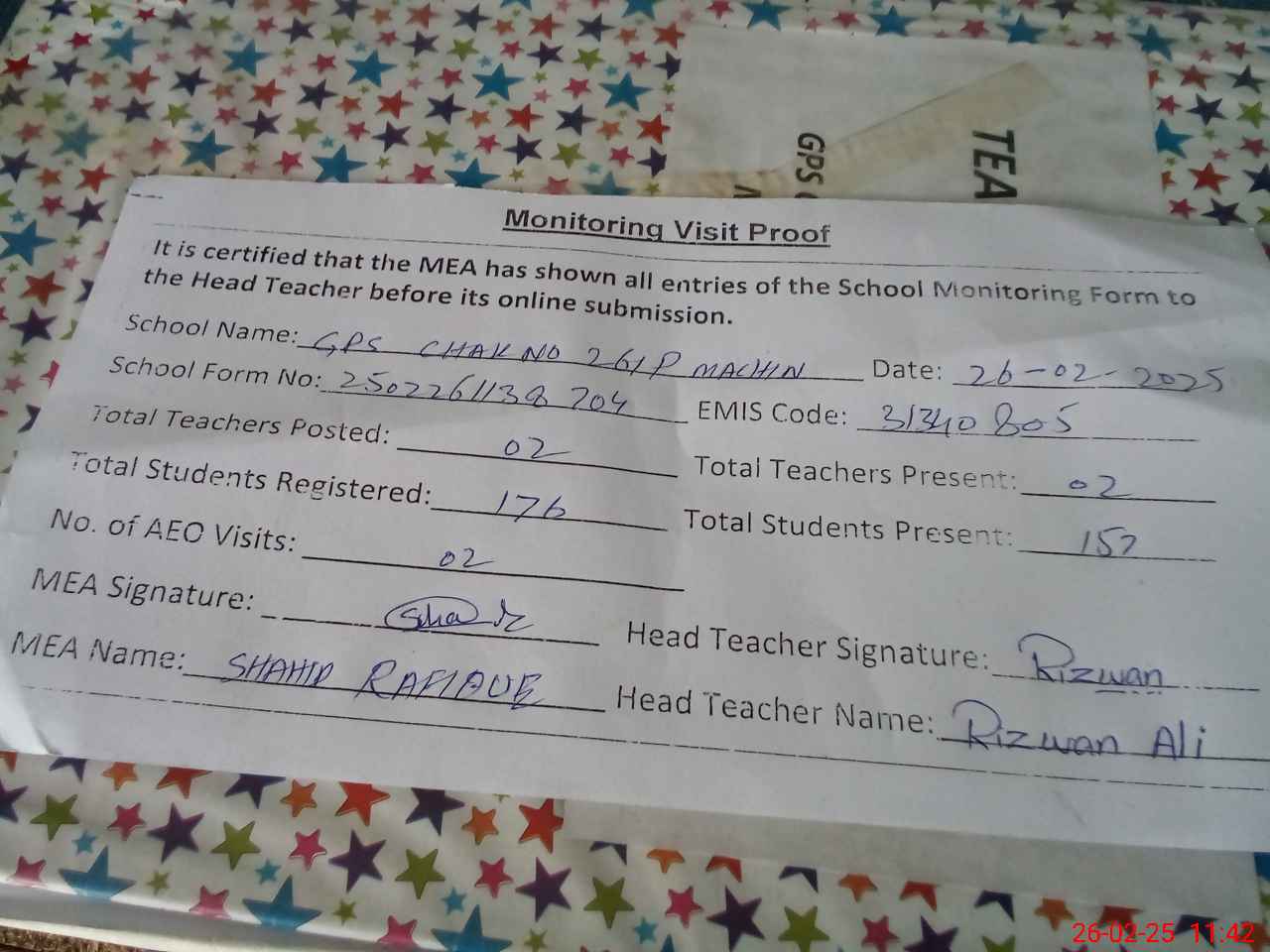 | EMIS Code: 31340805 | Name of School: GPS CHAK NO. 261/P (MACHAIN) | |||