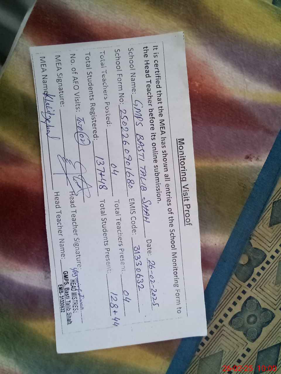 | EMIS Code: 31330632 | Name of School: GMPS BASTI TALIB SHAH | |||