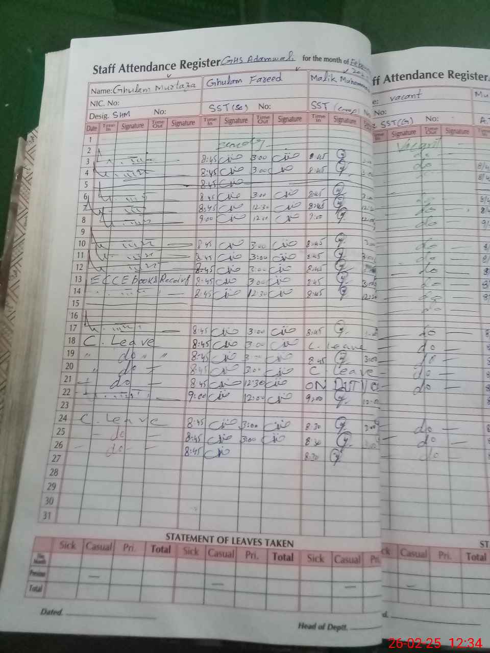 | Leave | Duty | Absent | Maternity | Medical | Ex- Pak |