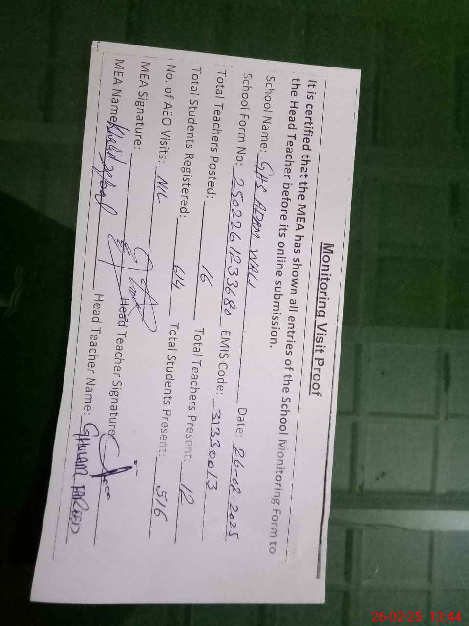 | Attendance Register | Head Teacher | MEA with School | Visit Proof |
