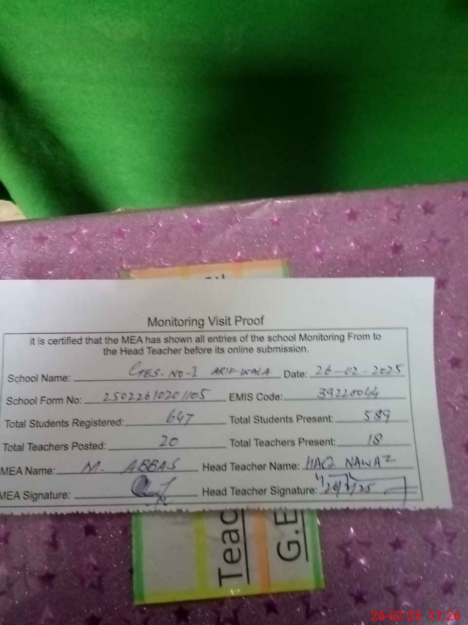 | EMIS Code: 39220044 | Name of School: GES NO. 1 ARIF WALA | |||