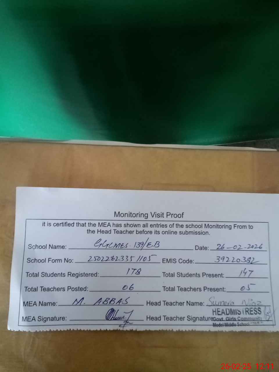 | Attendance Register | Head Teacher | MEA with School | Visit Proof |