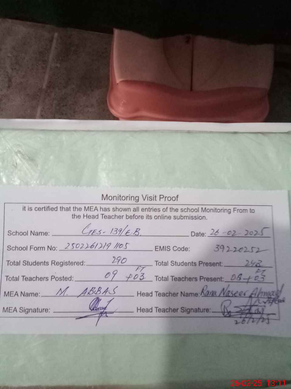 | Attendance Register | Head Teacher | MEA with School | Visit Proof |