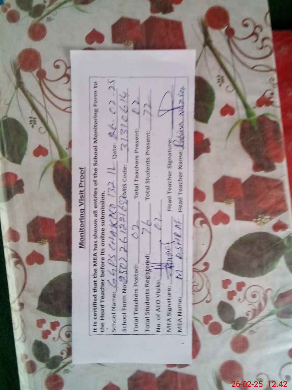 | Attendance Register | Head Teacher | MEA with School | Visit Proof |