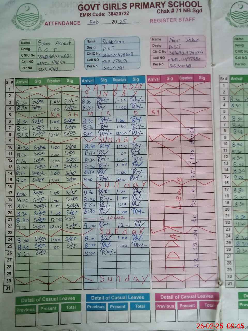 | CNIC | Full Name | Designation | R/C | Absence During Last Calender Month |