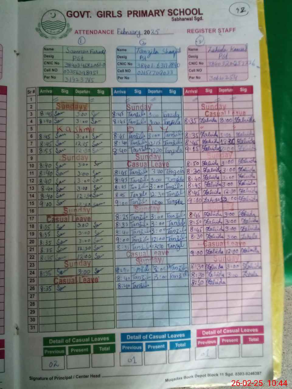 | CNIC | Full Name | Designation | R/C | Absence During Last Calender Month |