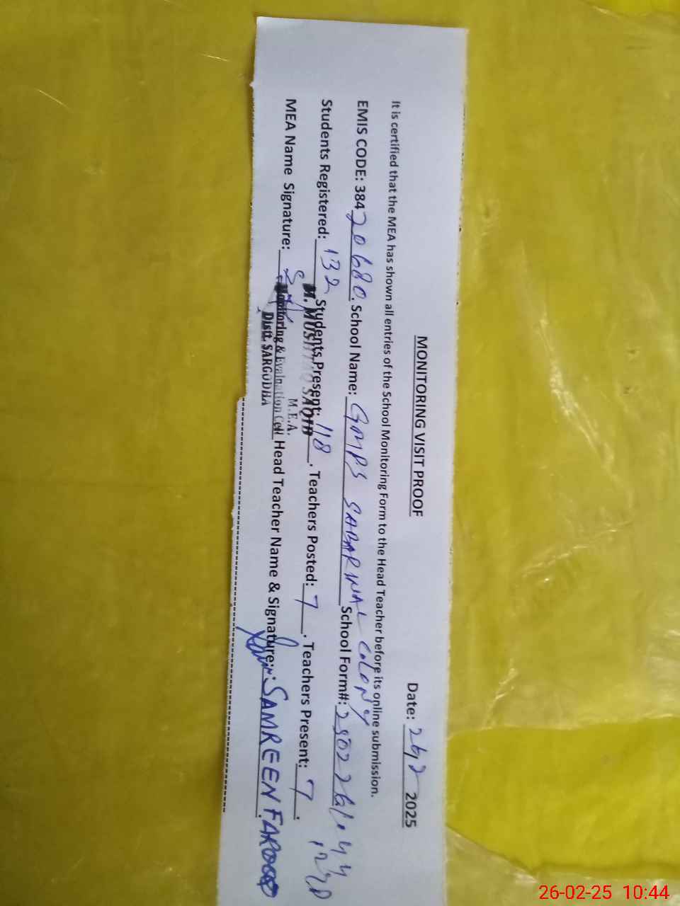| Attendance Register | Head Teacher | MEA with School | Visit Proof |