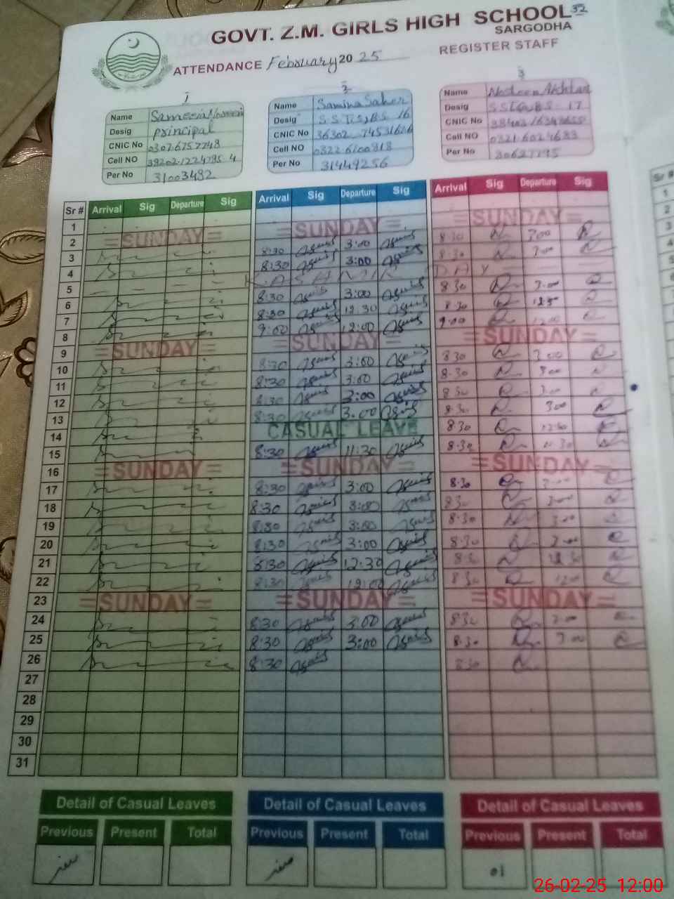 | CNIC | Full Name | Designation | R/C | Absence during last cal. month |