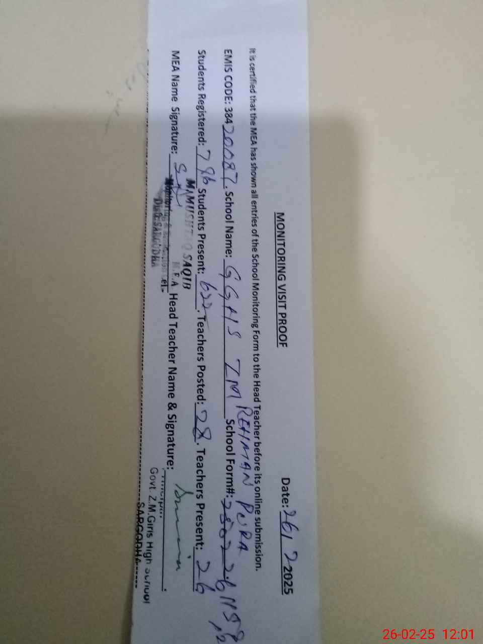 | Attendance Register | Head Teacher | MEA with School | Visit Proof |