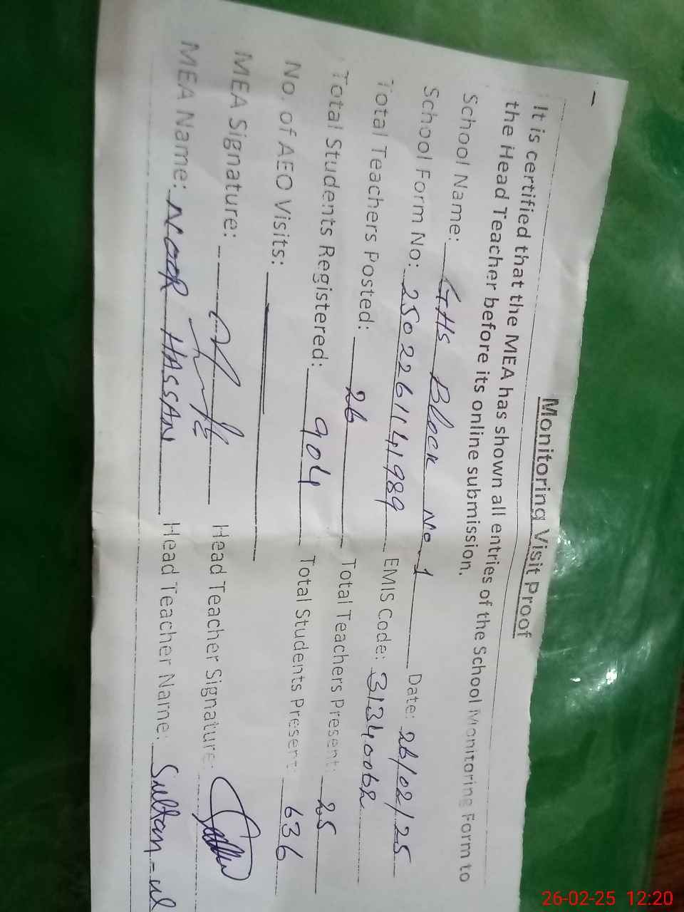 | EMIS Code: 31340062 | Name of School: GHS BLOCK NO.1 | |||