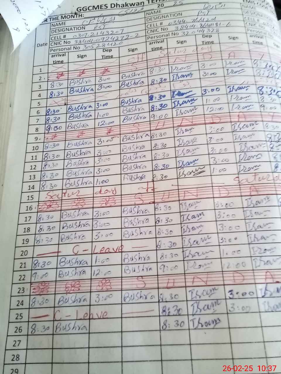 | CNIC | Full Name | Designation | R/C | Absence During Last Calender Month |