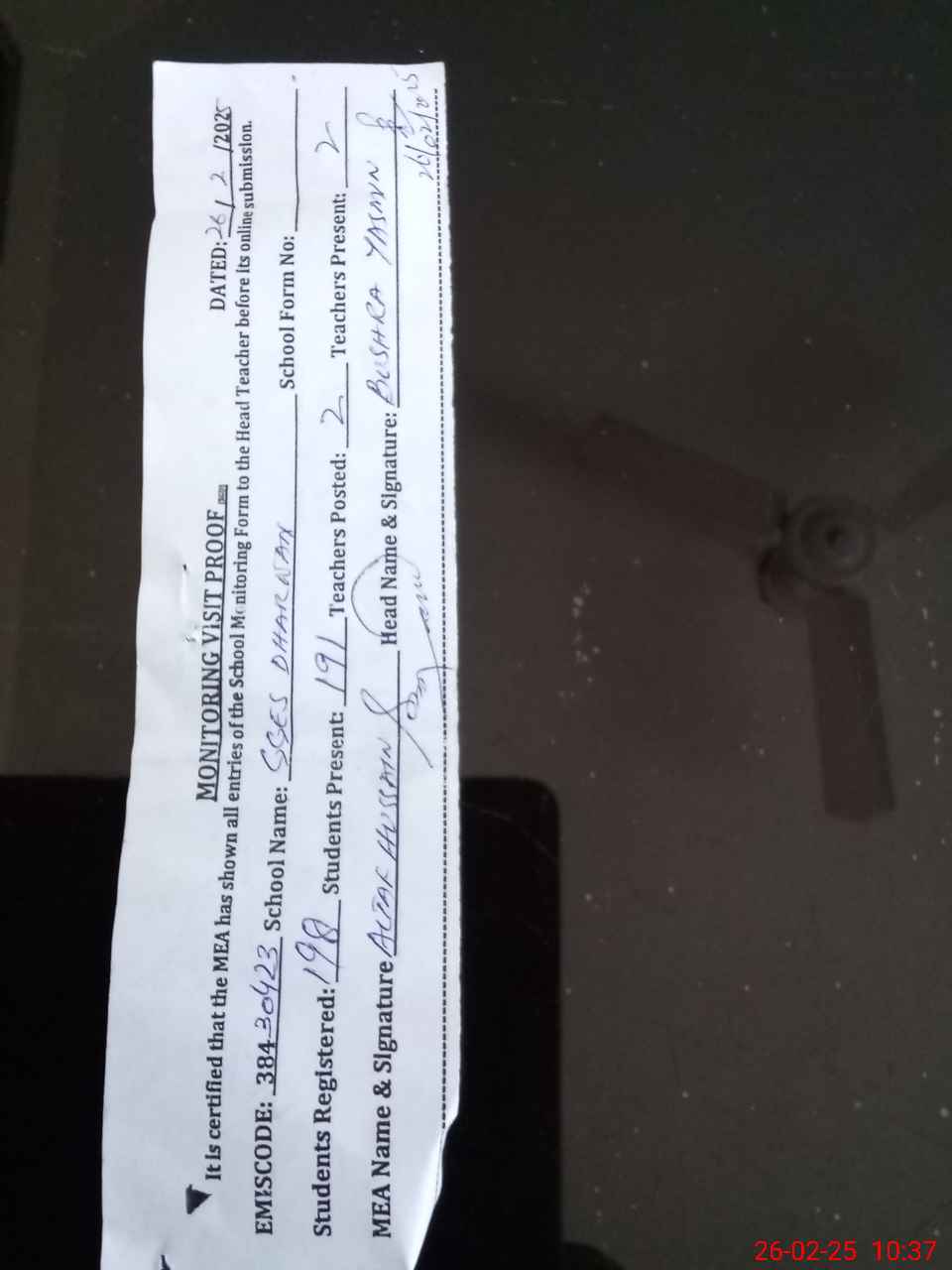 | Certified that this School was Inspected by the Undersigned MEA/DMO Today and the Information Stated Above is as Per Record. | |||||