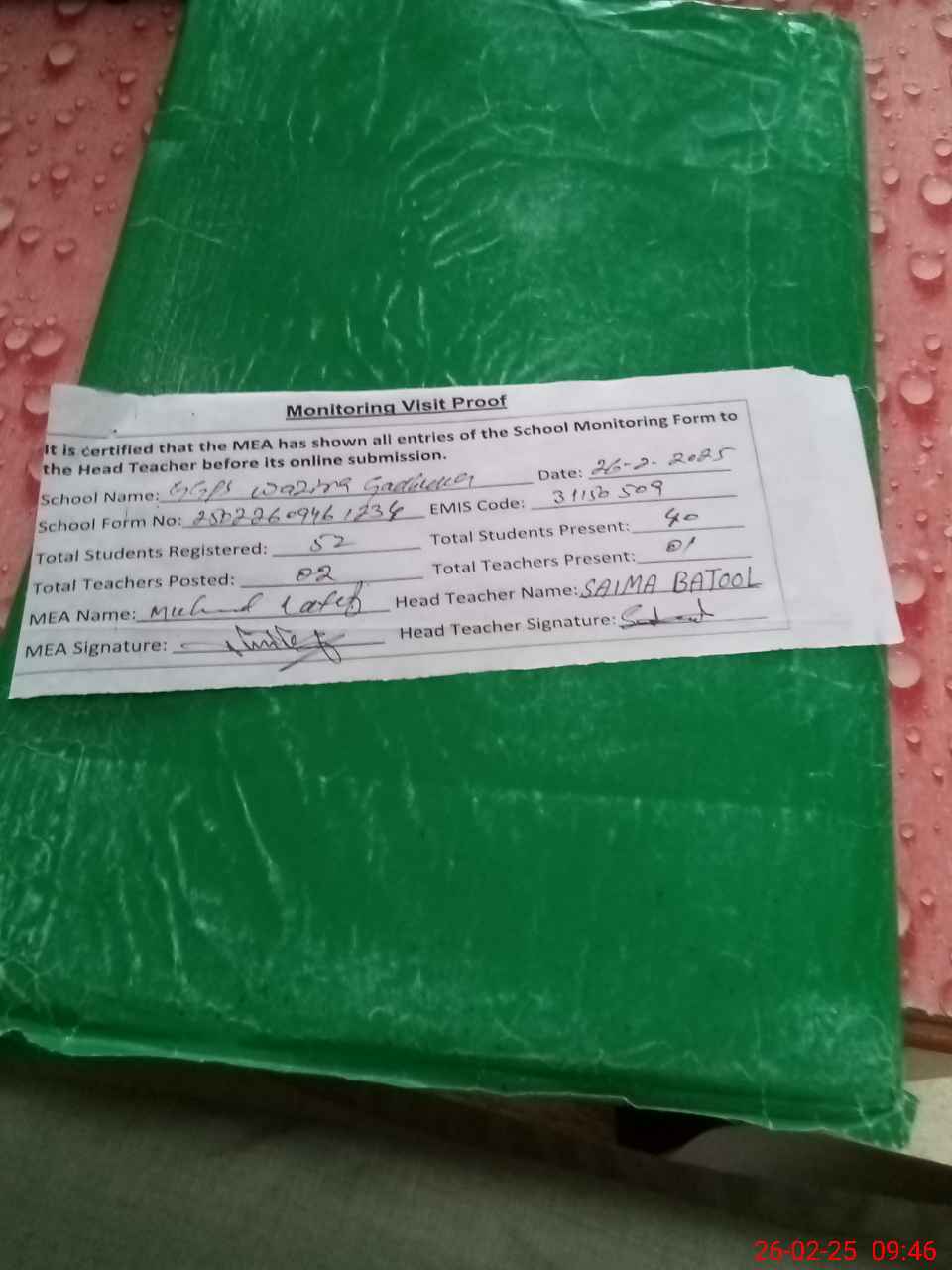 | Attendance Register | Head Teacher | MEA with School | Visit Proof |