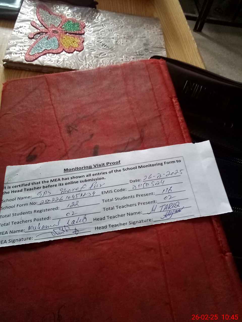 | Attendance Register | Head Teacher | MEA with School | Visit Proof |