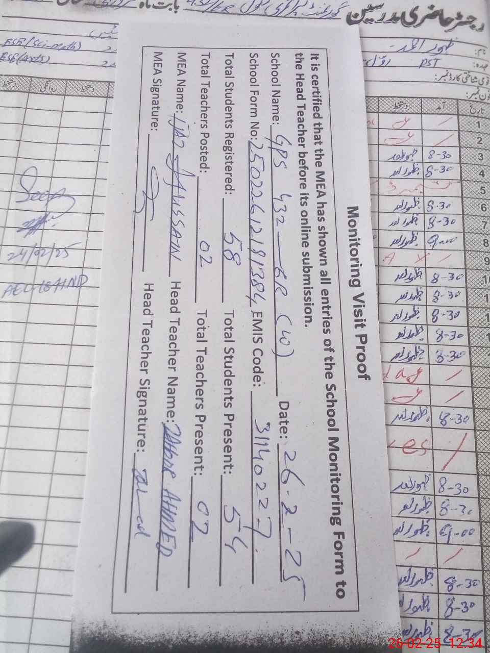 | Attendance Register | Head Teacher | MEA with School | Visit Proof |