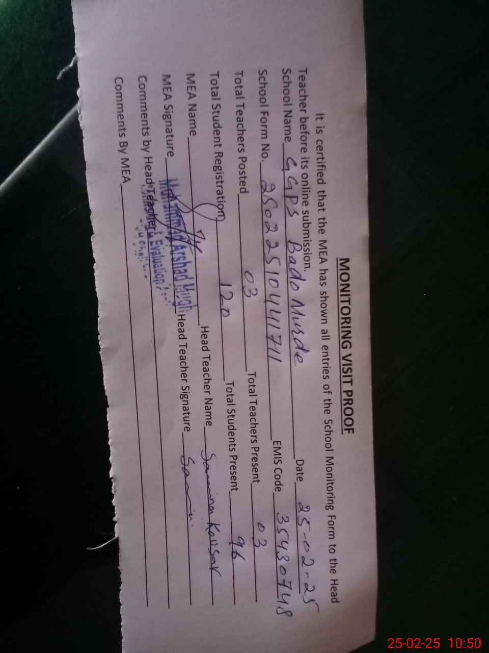 | Attendance Register | Head Teacher | MEA with School | Visit Proof |