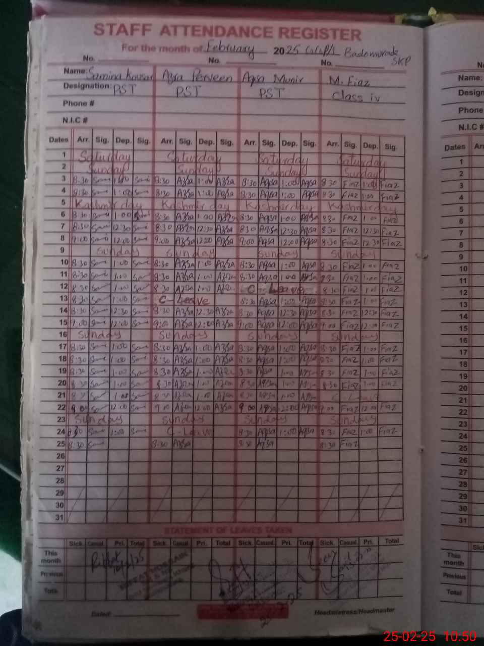 | CNIC | Full Name | Designation | R/C | Absence During Last Calender Month |