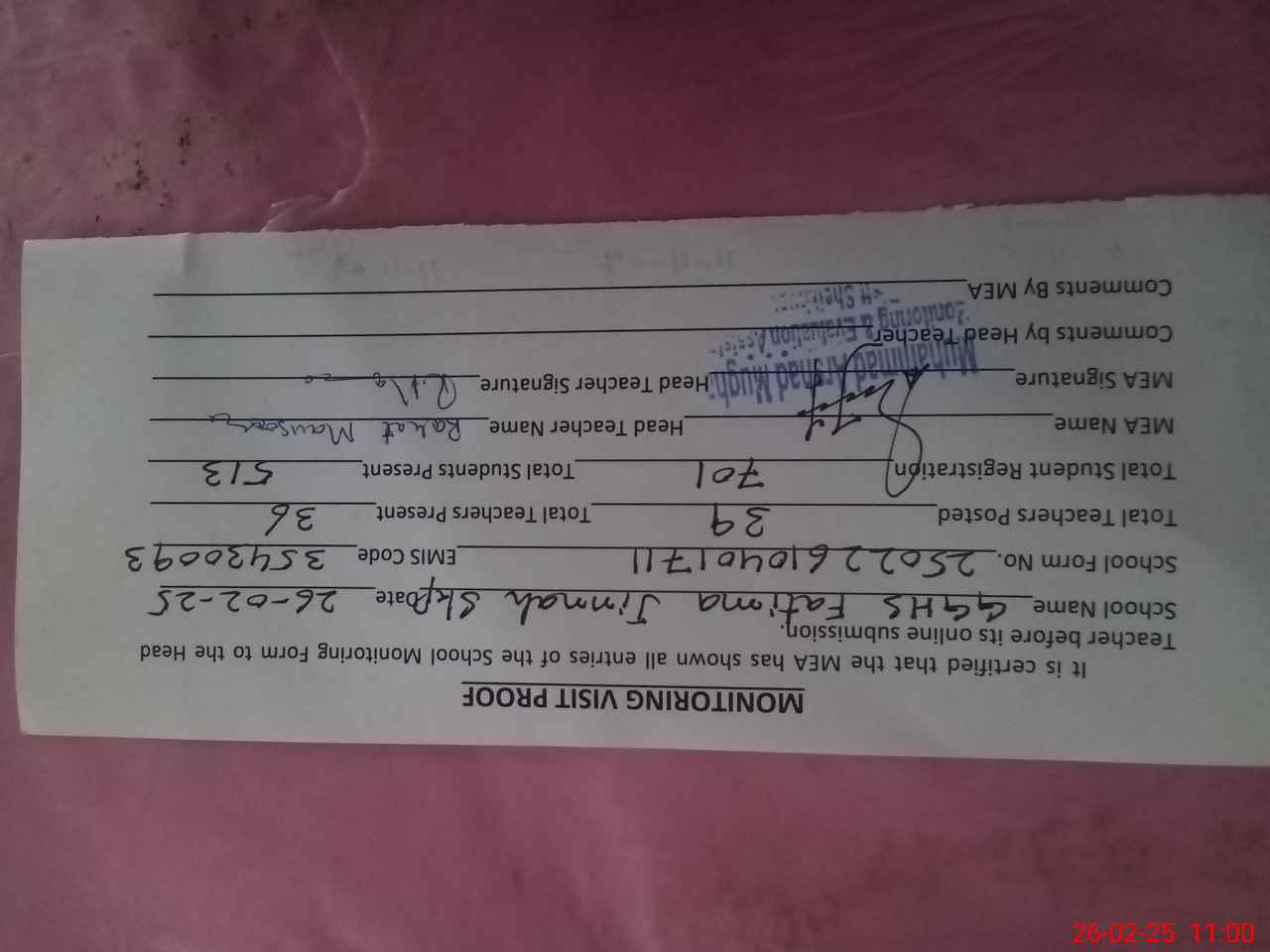| Attendance Register | Head Teacher | MEA with School | Visit Proof |