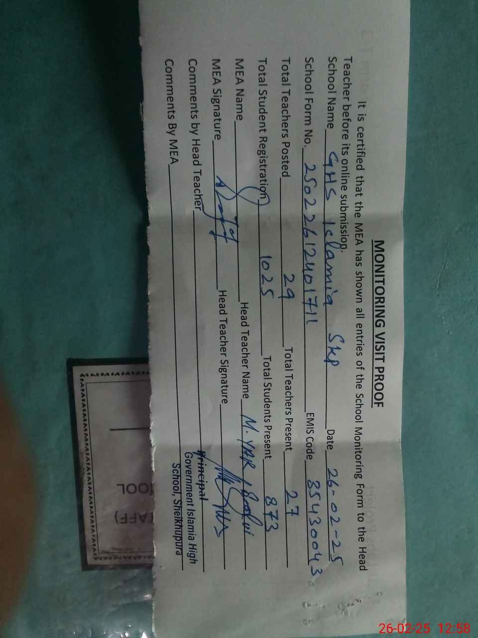 | Attendance Register | Head Teacher | MEA with School | Visit Proof |