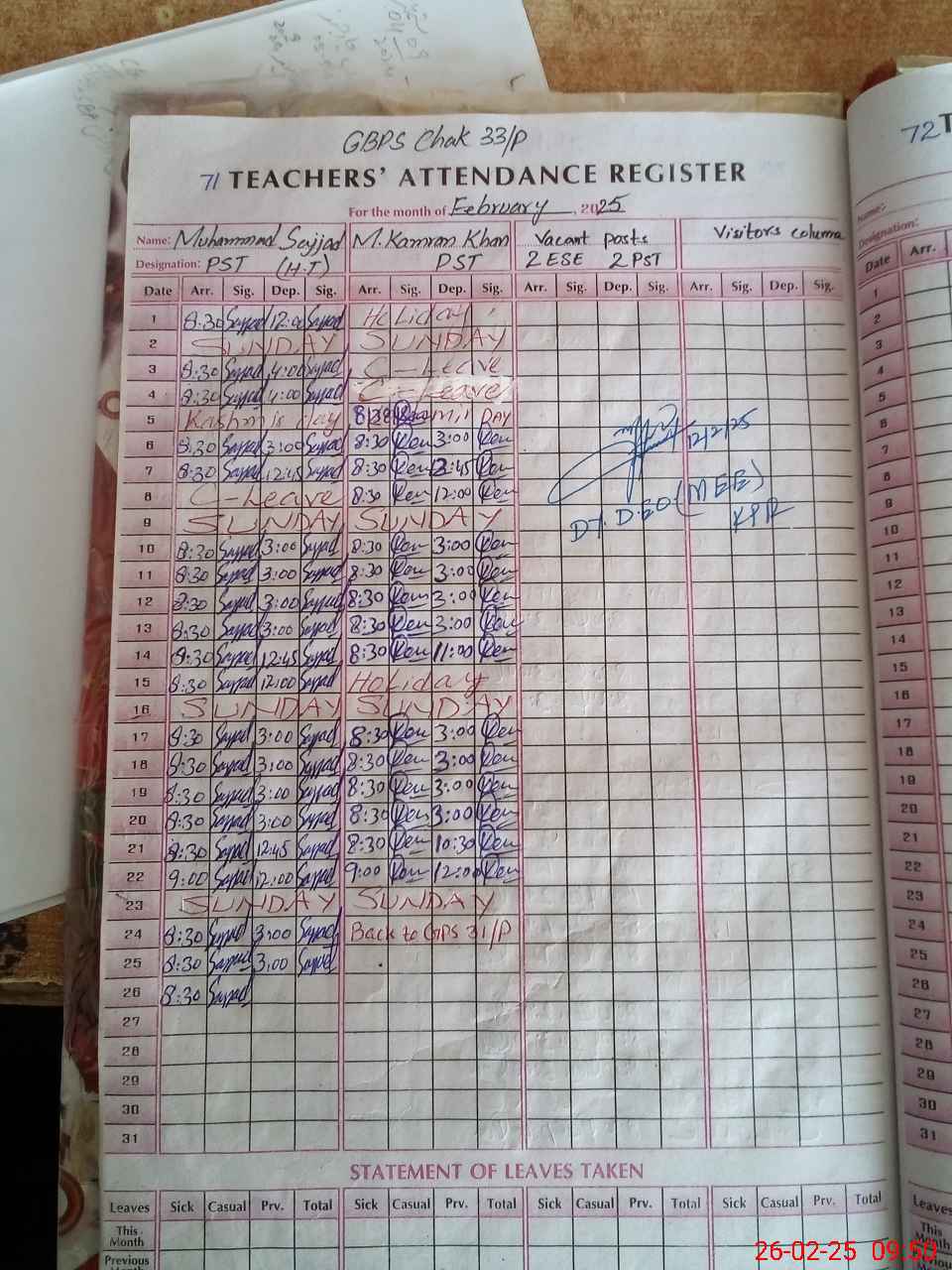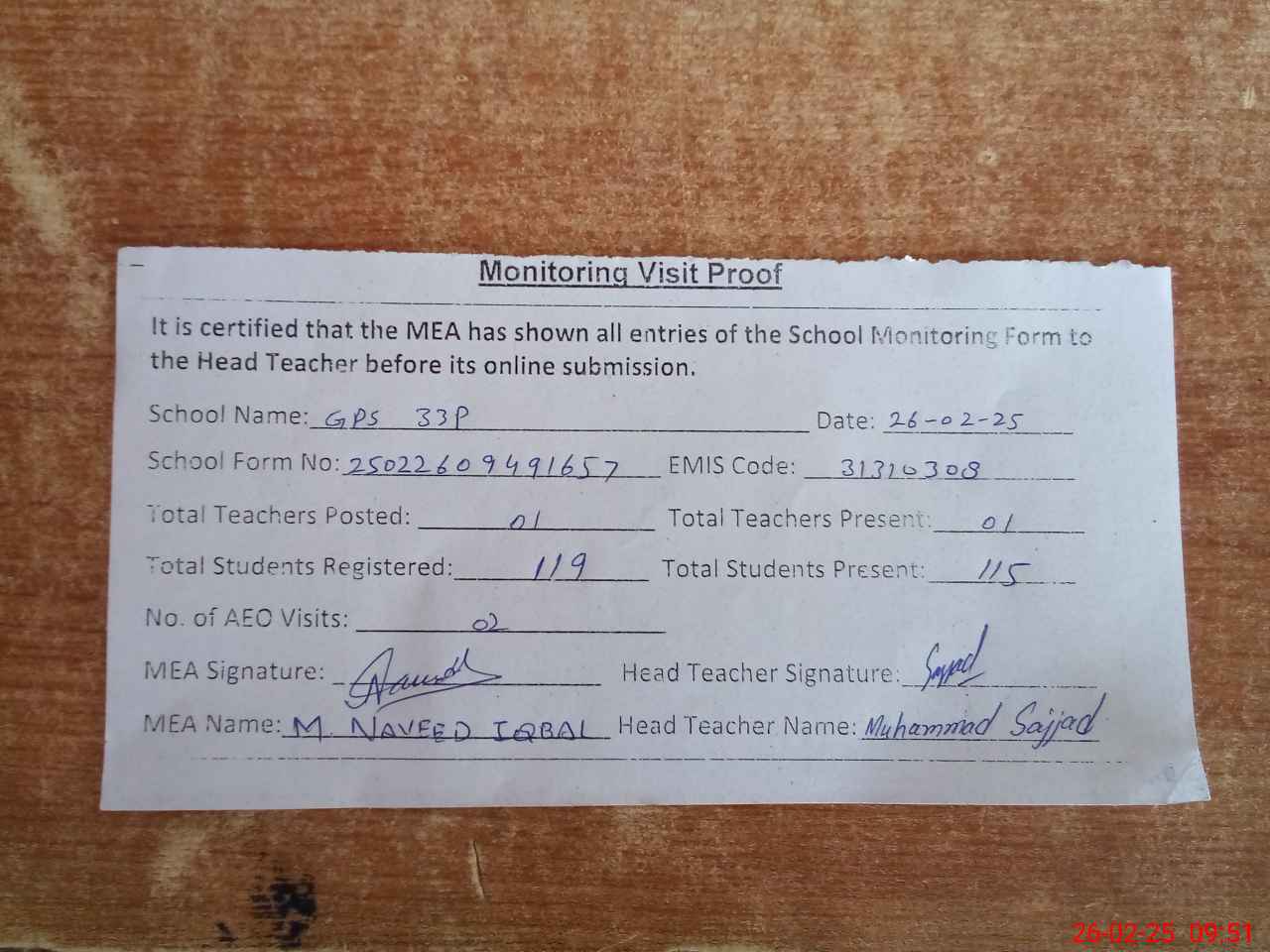 | Attendance Register | Head Teacher | MEA with School | Visit Proof |