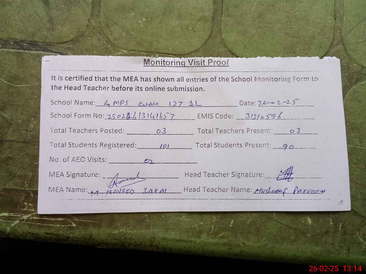 | Attendance Register | Head Teacher | MEA with School | Visit Proof |