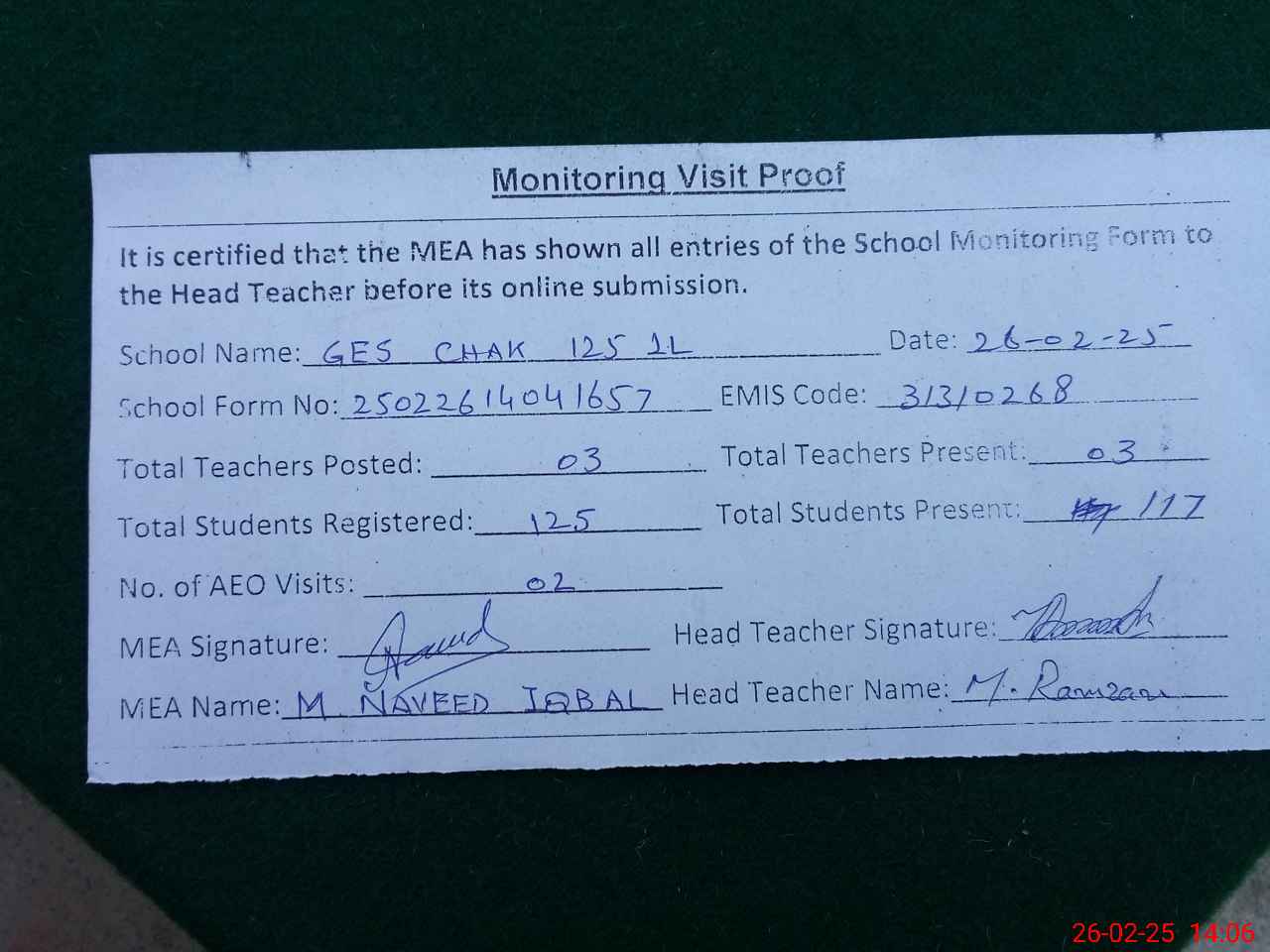 | Attendance Register | Head Teacher | MEA with School | Visit Proof |