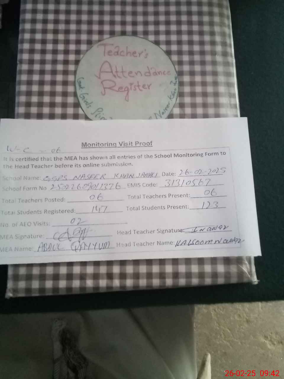 | Attendance Register | Head Teacher | MEA with School | Visit Proof |