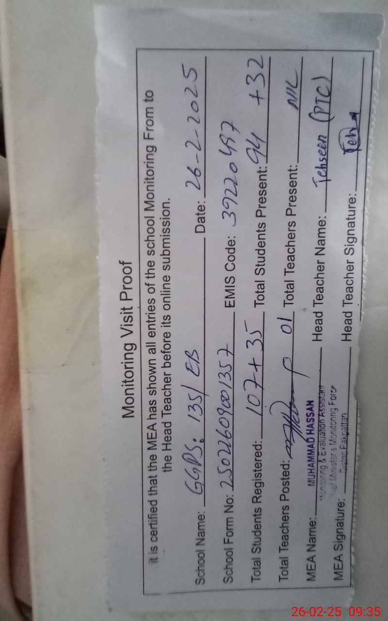 | Attendance Register | Head Teacher | MEA with School | Visit Proof |