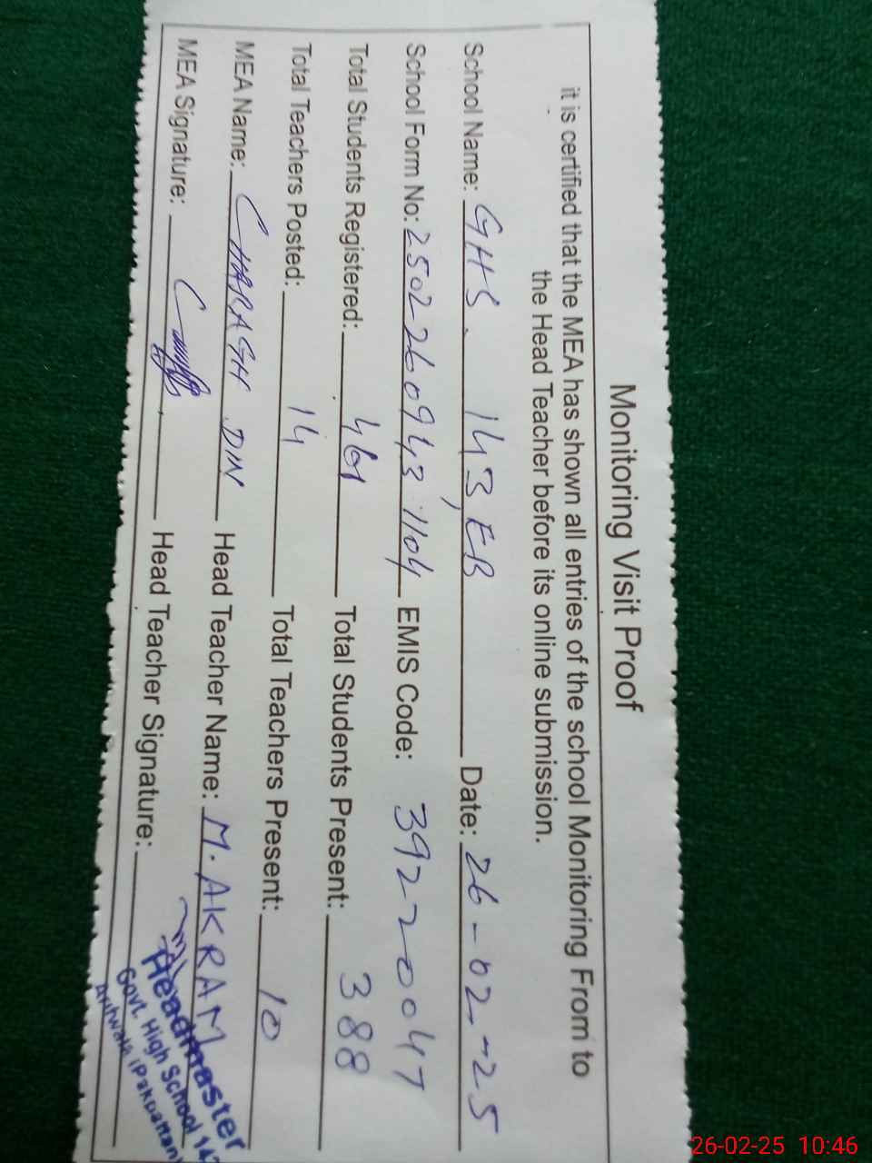 | Attendance Register | Head Teacher | MEA with School | Visit Proof |