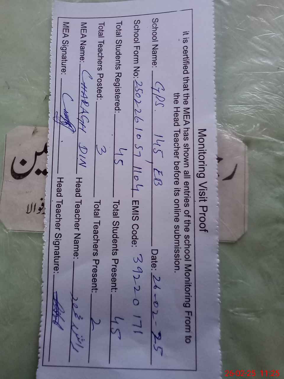 | Attendance Register | Head Teacher | MEA with School | Visit Proof |