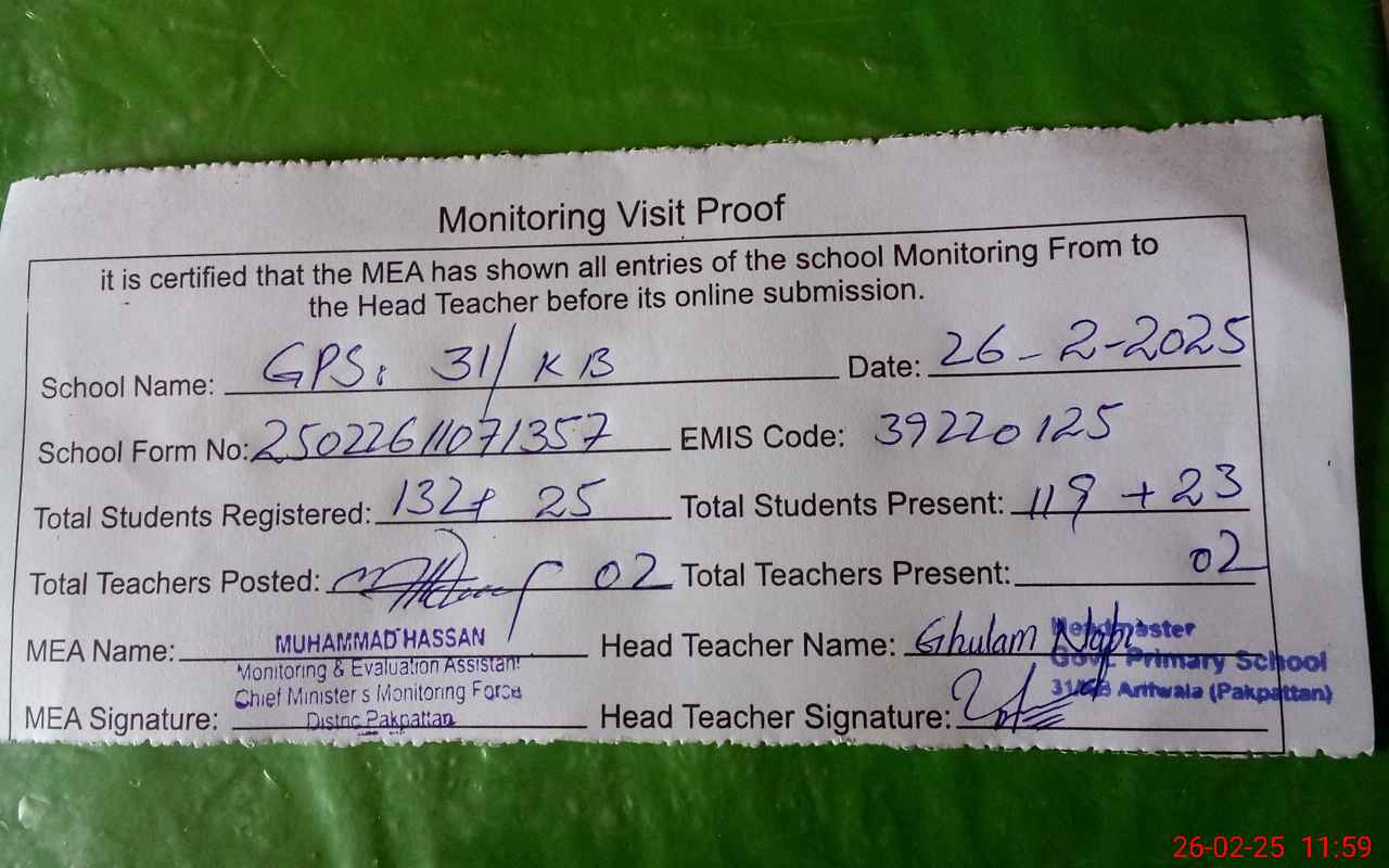 | EMIS Code: 39220125 | Name of School: GPS CHAK NO. 31 KB | |||