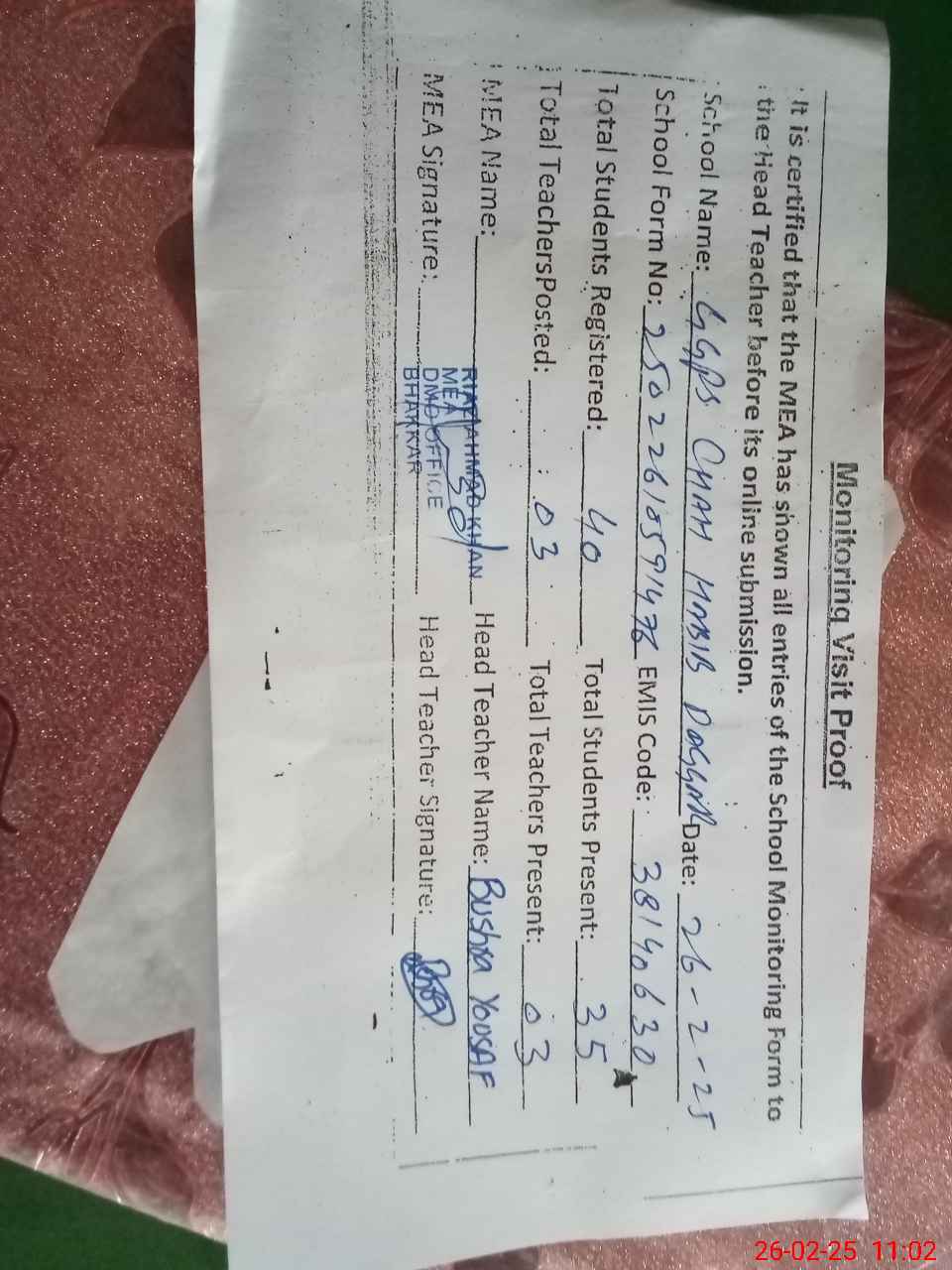 | Certified that this School was Inspected by the Undersigned MEA/DMO Today and the Information Stated Above is as Per Record. | |||||