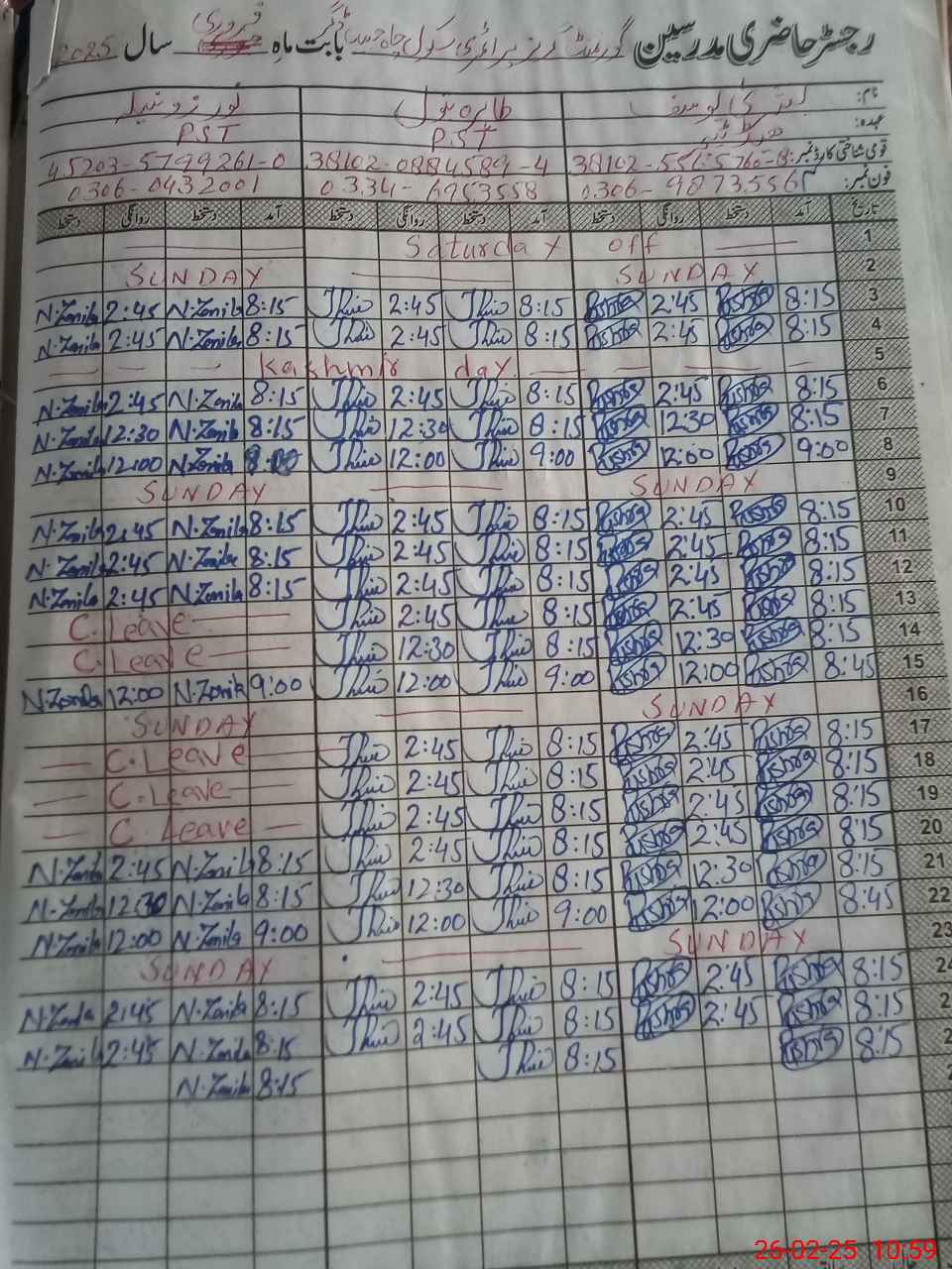 | CNIC | Full Name | Designation | R/C | Absence During Last Calender Month |