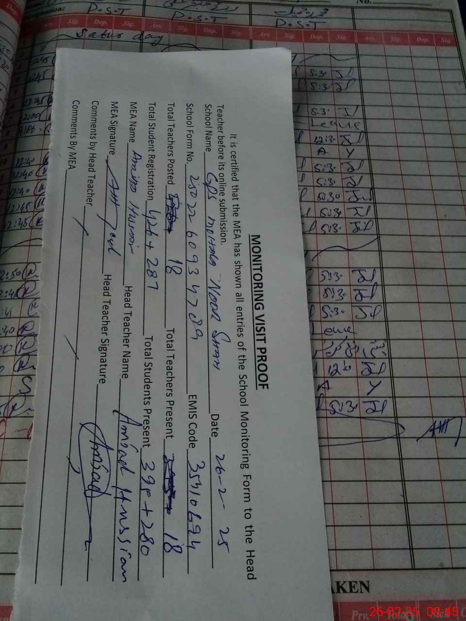 | EMIS Code: 35410694 | Name of School: GPS MOHALLA NOOR SHAH | |||