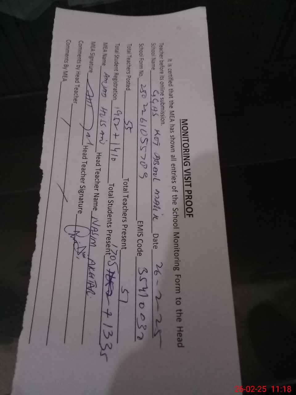 | Attendance Register | Head Teacher | MEA with School | Visit Proof |