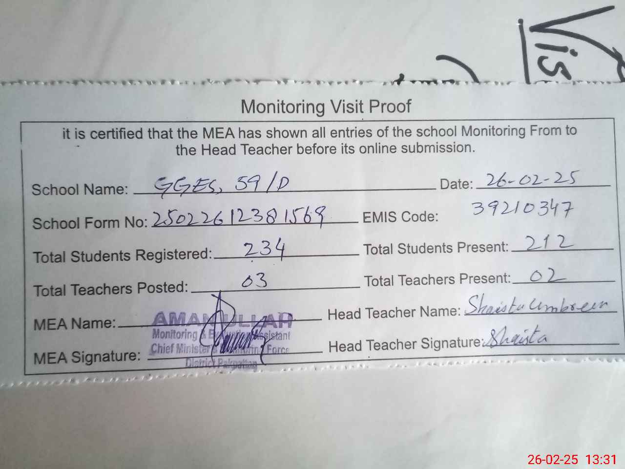 | Attendance Register | Head Teacher | MEA with School | Visit Proof |