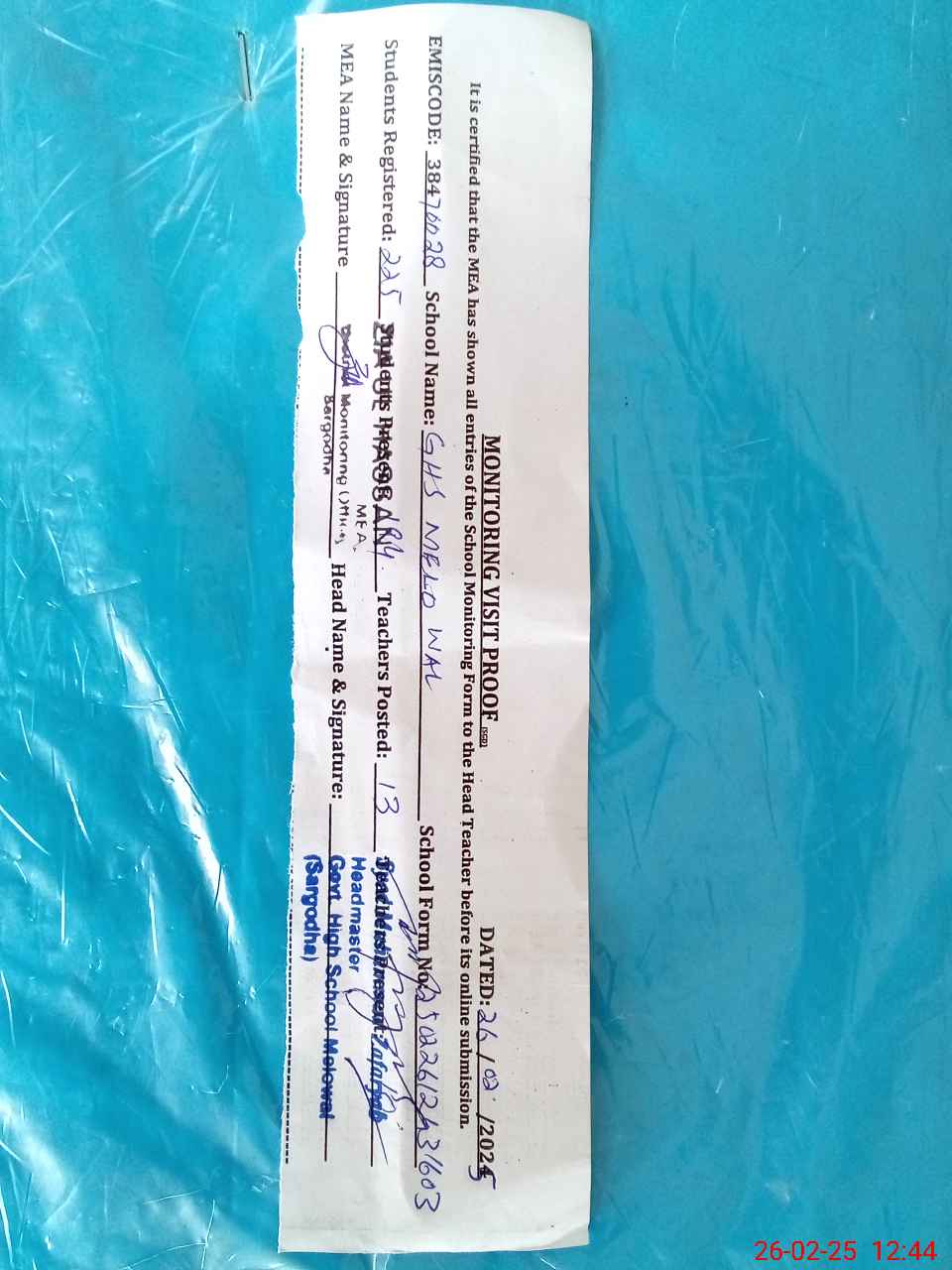 | Certified that this School was Inspected by the Undersigned MEA/DMO Today and the Information Stated Above is as Per Record. | |||||
