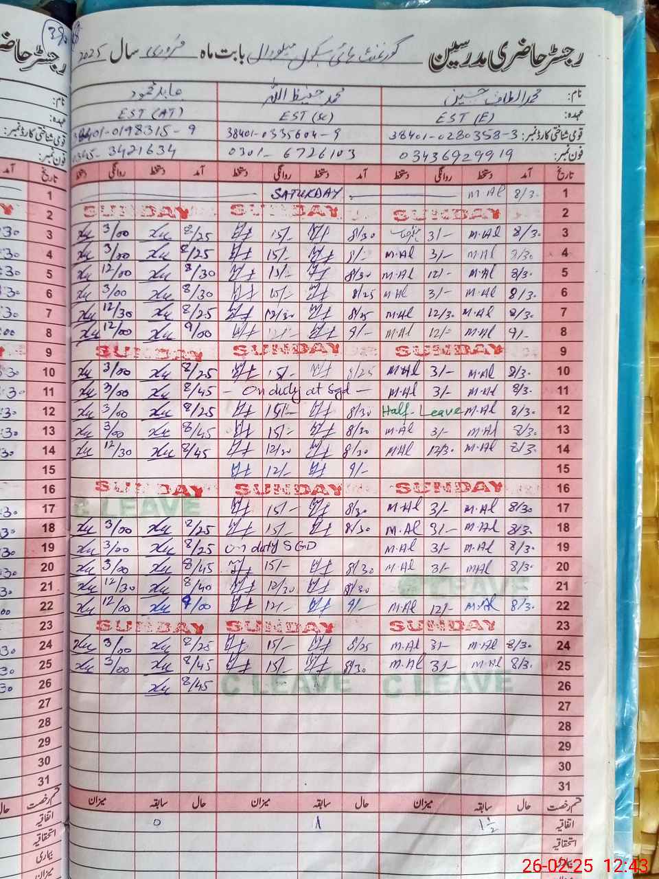 | CNIC | Full Name | Designation | R/C | Absence During Last Calender Month |