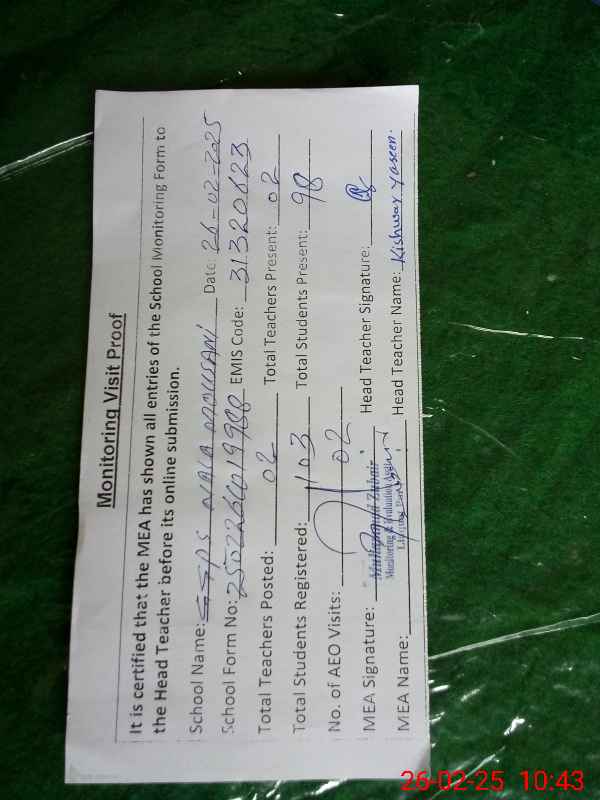 | Attendance Register | Head Teacher | MEA with School | Visit Proof |