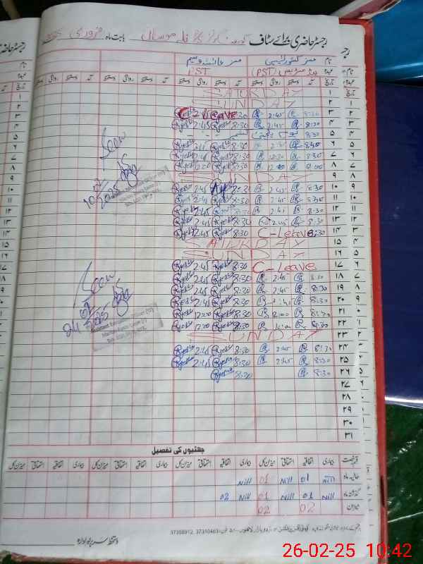 | CNIC | Full Name | Designation | R/C | Absence During Last Calender Month |