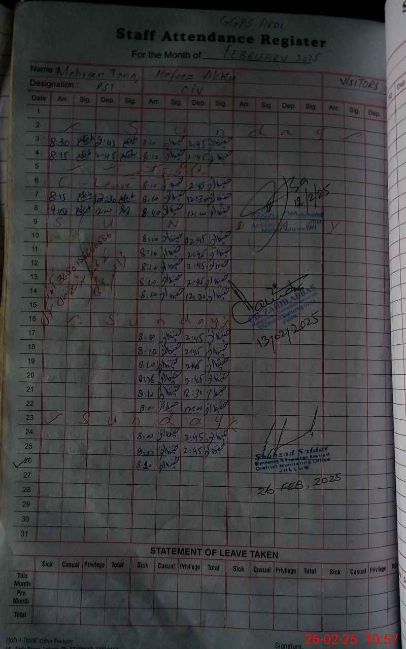 | CNIC | Full Name | Designation | R/C | Absence During Last Calender Month |