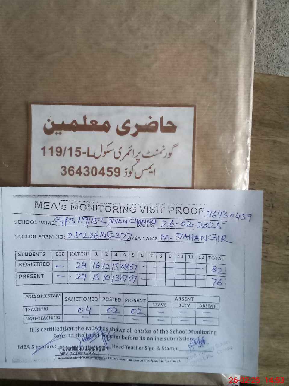 | EMIS Code: 36430459 | Name of School: GPS 119/15-L, MIAN CHANNU | |||